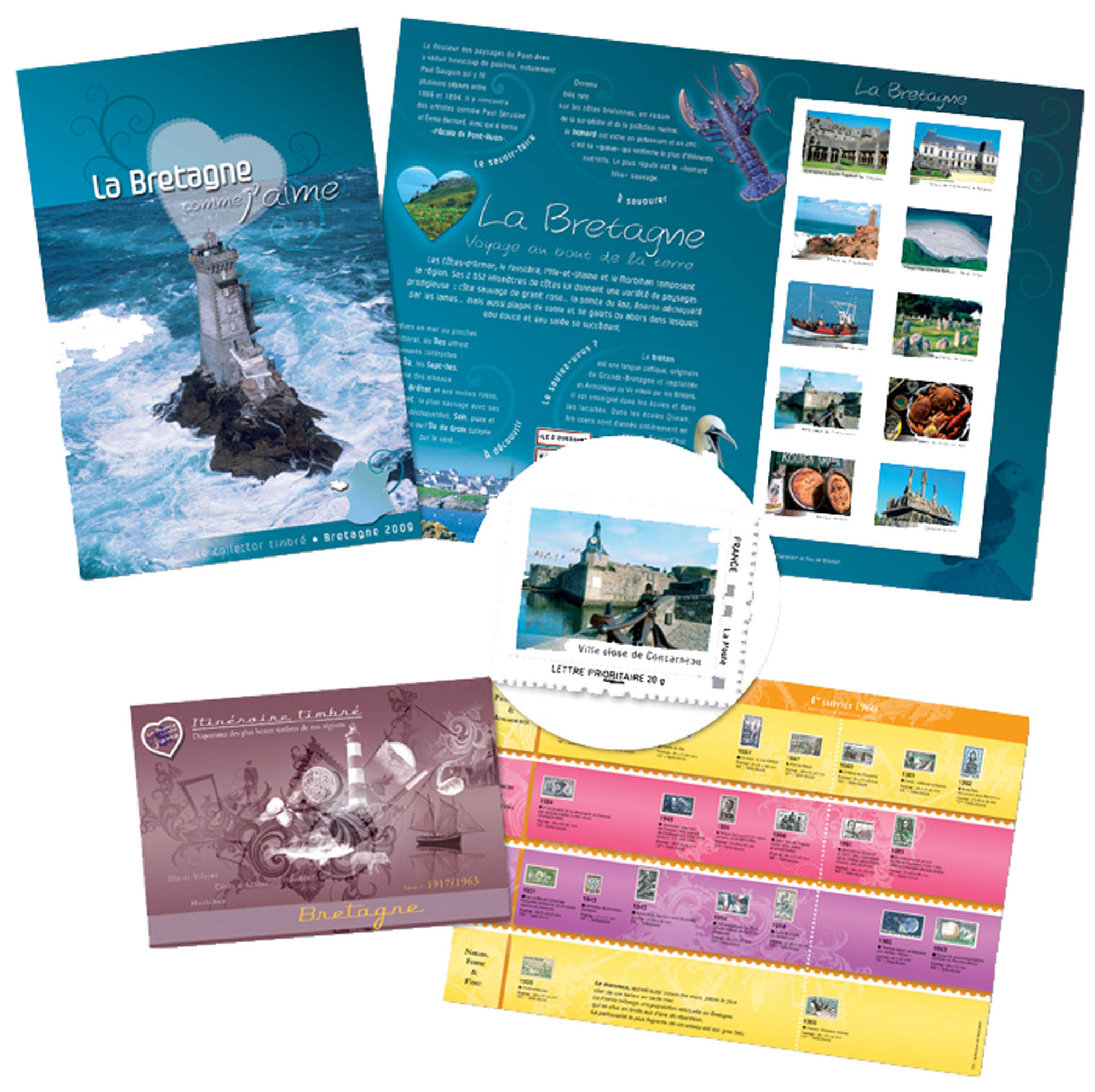 | Commentaire | 20 g France - Le collector timbré régional (22 régions+ 1 collector spécial Paris + 1 collector Antilles) = 24Cathédrale Saint Tugdual de Tréguier (Côtes d’Armor) : c’est du cloître du XVe siècle que l’on a le meilleur point de vue sur l’édifice. Palais du Parlement à Rennes (Ille et Vilaine) : édifié en 1618, détruit par un incendie en 1994, ce bâtiment qui abrite depuis 1804 la Cour d’Appel de Bretagne a été reconstruit à l’identique Phare de Ploumanach (Côtes d’Armor) : construit en granit rose, il indique l’entrée du port. Plage des Grands Sables - Île de Groix (Morbihan) : remarquable par sa forme en arc de cercle autour d’une pointe, elle présente la particularité de changer de place sous l’action du vent. Pêche en mer (Bretagne) : la Bretagne est la 1ère région française de pêche en mer Mégalithes de Carnac (Morbihan) : près de 4000 pierres levées forment d’exceptionnels alignements de menhirs et dolmens sur plus de 4 km .Ville close de Concarneau (Finistère) : le monument historique le plus visité en Bretagne, avec ses remparts construits par Vauban au XVIIe siècle. Plateau de fruits de mer (Bretagne) : tourteaux, araignées, crevettes, palourdes, bigorneaux… à peine péchés, c’est un plaisir de les déguster ! Kouign Amann (Finistère) : spécialité de Douarnenez, son nom signifie gâteau au beurre en breton. Calvaire breton : parsemant les chemins, comme celui de Notre Dame de Tronoën (Finistère) ces monuments sont sculptés en bas relief |