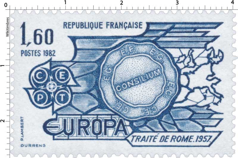Timbre : 1982 EUROPA CEPT TRAITÉ DE ROME.1957. CONCILIUM CE. EG. EF. EC. Mesures Format d'imp 36 x 22 mm Dents incluses 40 x 26 mm Forme horizontal Phosphore Non Impression Taille-douce Complément xxxxx Couleur bleu foncé Valeur 1 F 60 c Dentelure 13 Emis en feuille de 50 TP Quantité 12 000 000 Auteurs Dessinateur Pierrette Lambert Graveur Claude Durrens Mise en page xxxxx Mentions Création de Pierrette Lambert Numéros & Dates N° Philatelix 2360 N° Michel 2329 Date d'émission 26/04/1982 Date de retrait 10/06/1983 Classements Groupe EUROPA Catégorie Timbres poste Familles Europa type Usage lettres simples jusqu'au 31 mai 1982 puis plis non urgents Régions - Départements - Description Traité de Rome en 1957 Commentaire - Mes timbres & notes personnelles www.wikitimbres.fr
