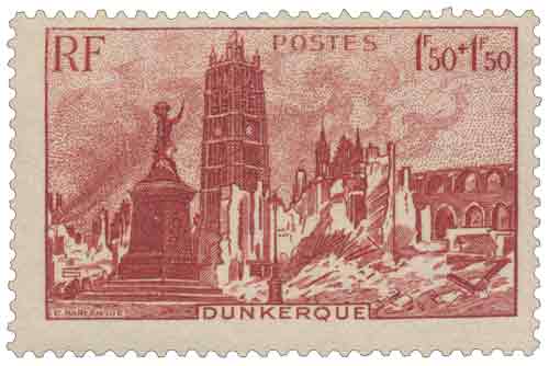 | Commentaire | Le timbre gommé de 1945 « Dunkerque, ville martyre » s’inscrit dans la série des émissions de solidarité nationale consacrées à la reconstruction des villes françaises dévastées par la Seconde Guerre mondiale. Mis en vente le 5 novembre 1945, il correspond au tarif de la carte postale pour le régime intérieur et comporte une surtaxe égale à la valeur faciale, destinée à l’Entraide Française, organisme chargé d’apporter une aide matérielle aux populations sinistrées. Dessiné par Gabriel-Antoine Barlangue, le visuel adopte un format horizontal et une iconographie évocatrice des destructions massives subies par Dunkerque, ville presque entièrement ruinée à l’issue des combats et des bombardements. L’impression en taille-douce rotative confère à l’ensemble une gravité et une lisibilité adaptées au message mémoriel, tandis que la diffusion relativement brève, jusqu’en mars 1946, souligne le caractère circonstanciel et caritatif de l’émission.