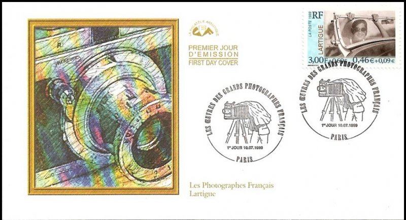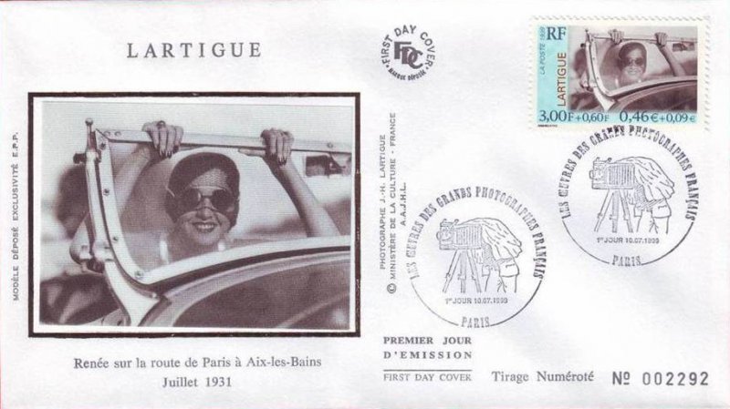 | Commentaire | Description synthétique du visuel du timbre : Jacques Lartigue (1894, 1986) prend ses premières photographies avec l’aide et l’appareil de son père. Il découvre instinctivement cet appareil et tient un journal des petits évènements de sa vie. Il élabore ainsi jusqu’à sa mort une biographie réfléchie, par nature quelque peu fictive, consignée en images dans de volumineux albums. La photographie “ Route de Paris, Aix les Bains, Renée ” qui illustre le timbre, témoigne de l’aspect de ses photographies saisies au vif, instants heureux de sa vie et de ses amours. Ces personnages de la haute bourgeoisie saisis par Lartigue soulignent l’aspect sociologique de son œuvre. Les reflets du fond du visuel évoquent subtilement, dans des tons bleus, le bain des tirages photographiques. |