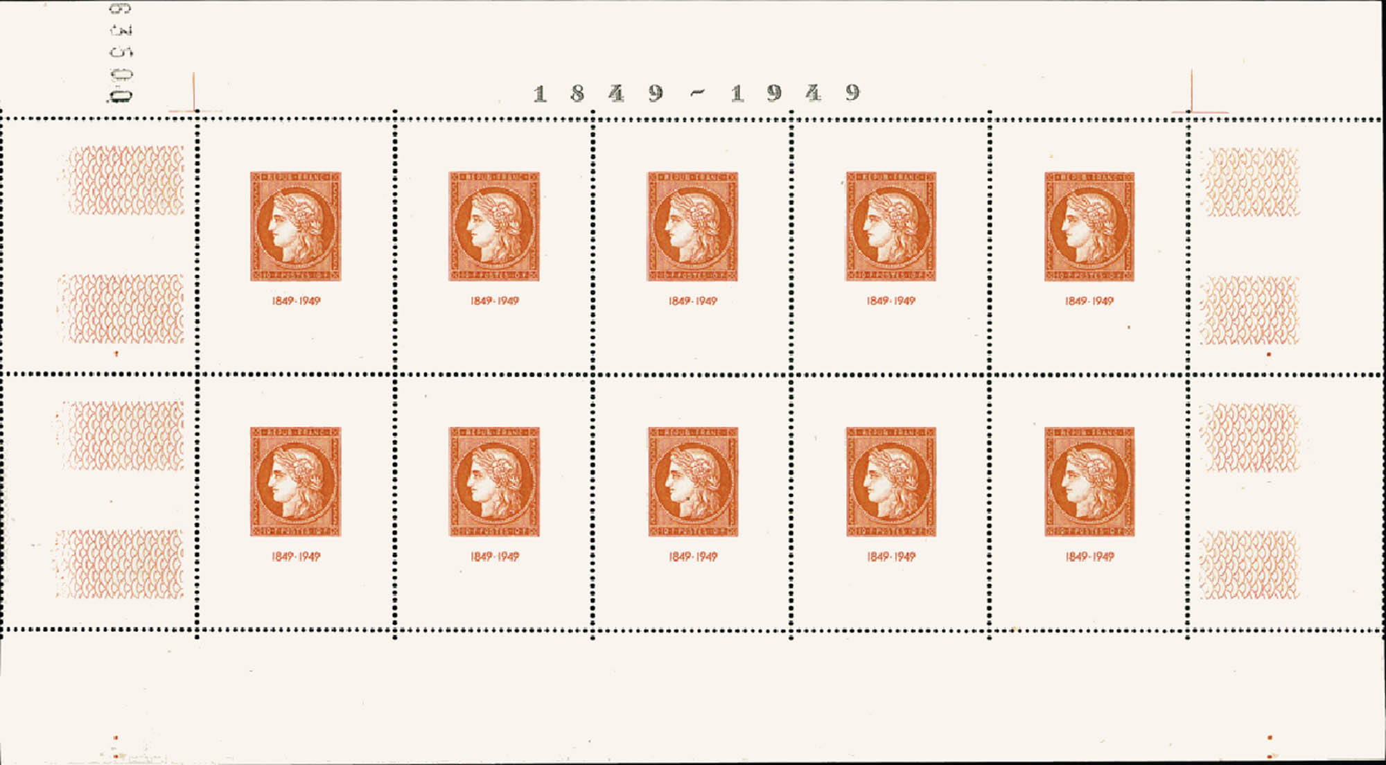 | Description | Exposition du centenaire du Timbre (Paris CITEX). Timbre non dentelé (avec dentelure extérieure pour découpage), imprimé par feuilles de dix de 154x279. Chaque feuille porte dans la marge supérieure les millésimes 1849-1949 (format d'un timbre : 40x52) |
