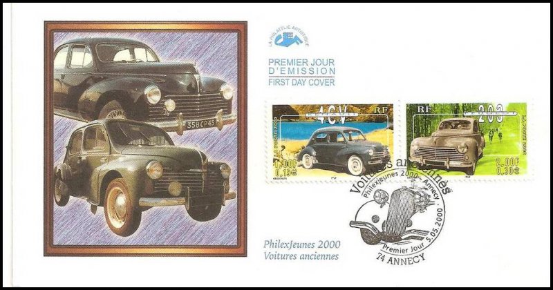 | Commentaire | Description synthétique du visuel du timbre : Dans la continuité de la feuille Armada du Siècle Rouen 1999, qui inaugurait la Collection Jeunesse, la feuille émise en 2000, à l’occasion de l’exposition Philexjeunes 2000, rend hommage aux voitures anciennes. Elle regroupe les dix voitures ayant marqué le siècle et ayant été le plus plébiscitées par les jeunes et les adhérents des associations automobiles : Bugatti 35, Volkswagen Coccinelle, Citroën Traction, Cadillac 62, Renault 4CV, Peugeot 203, Simca Chambord, Citroën DS19, Hispano-Suiza K6 et Ferrari 250 GTO. Le contour du bloc est illustré de voitures et d’accessoires évoquant l’univers de l’automobile. Les voitures sont traitées de façon réaliste et positionnées sur un fond monochrome ou dichrome évoquant l’environnement ou les évènements auxquels les Français les associent. Ce principe graphique contribue à mettre en valeur chacune des automobiles dans une ambiance très colorée. Émis uniquement en feuillet |