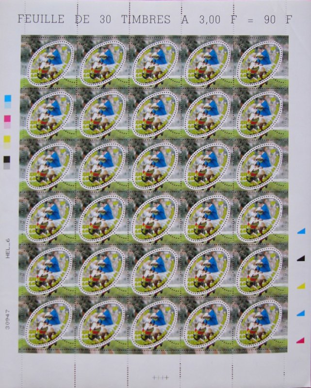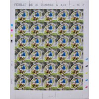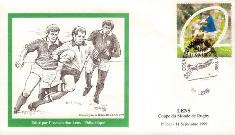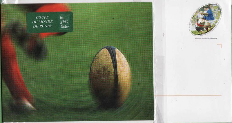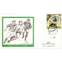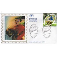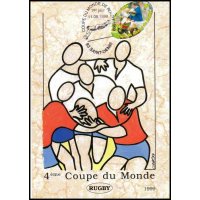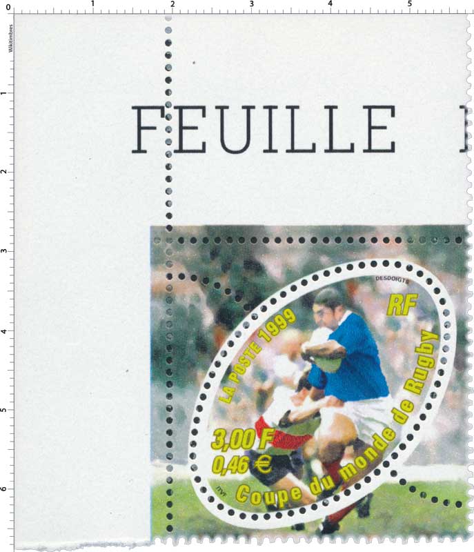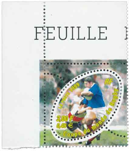 | Commentaire | Émis également en bloc de 10. Description synthétique du visuel du timbre : C’est un timbre de forme ovale qui commémorera la quatrième coupe du monde de Rugby. Cette compétition, co-organisée par la France et les nations britanniques, se déroulera du 1er octobre au 06 novembre 1999. 20 équipes participeront à cette coupe du monde (5 poules de 4). Une tentative de placage sur un joueur de l’équipe de France illustre le visuel et lui confère dynamisme et modernité. L’innovation tient autant à la forme ovale qu’ au pourtour carré imprimé dans lequel le timbre s’insère. Une image pleine page, prolongeant le timbre, orne le pourtour. |