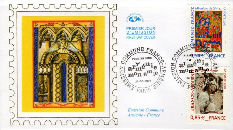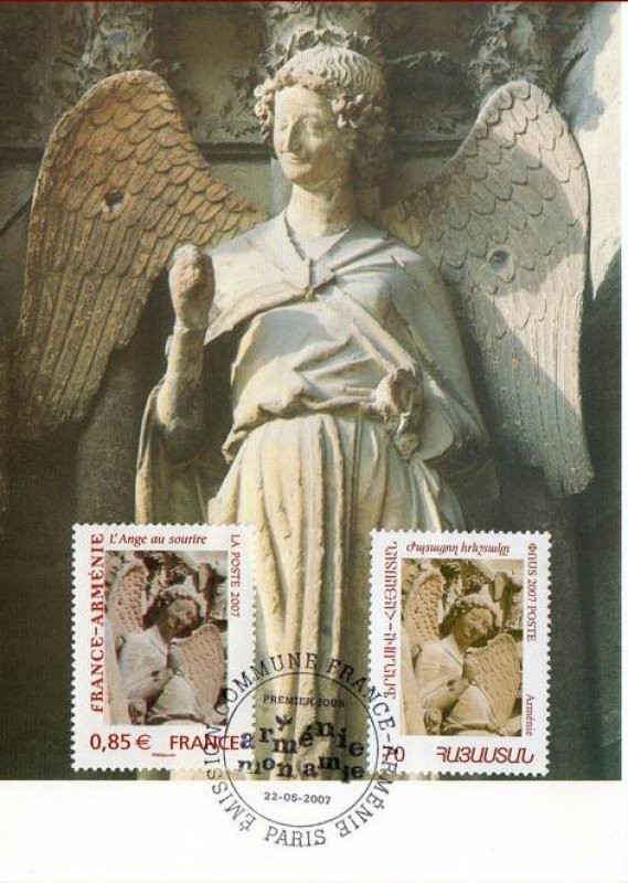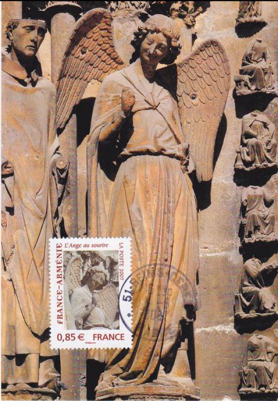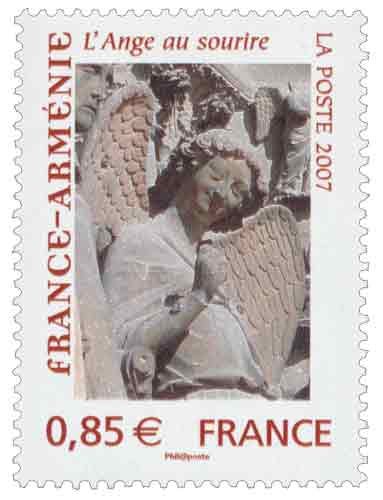| Commentaire | A l’occasion de l’année de l’Arménie en France en 2007, La Poste réalise une émission commune de timbres-poste avec la poste arménienne. Afin de mettre en lumière la richesse culturelle de nos 2 pays, il a été choisi d’illustrer le timbre représentant la France par « l’Ange au sourire » de la Cathédrale de Reims et le timbre représentant l’Arménie par une miniature datant de 1460 et ayant pour thème de la Nativité. |