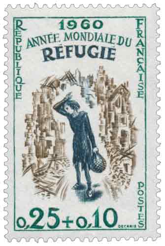 Émis en 1960, ce timbre à surtaxe s’inscrit dans la politique humanitaire et internationale de la France au tournant des années 1960, en relayant l’initiative portée par l’Assemblée générale des Organisation des Nations Unies qui proclame l’Année mondiale du réfugié afin de mobiliser les États et les opinions publiques face à une situation héritée des bouleversements politiques et des conflits du milieu du XXᵉ siècle. À cette date, plusieurs centaines de milliers de personnes déplacées vivent encore en Europe, notamment en France, dans l’attente d’une réinsertion durable, et l’émission de ce timbre traduit la volonté des pouvoirs publics d’associer le geste postal quotidien à un effort de solidarité concrète, la surtaxe étant reversée, par l’intermédiaire de la Croix-Rouge française, au comité national chargé de coordonner l’aide. Par son iconographie sobre et allégorique, confiée à Albert Decaris, et par le recours à la surtaxe, ce timbre illustre une tradition philatélique française qui utilise l’image et la circulation postale comme vecteurs de sensibilisation collective, tout en inscrivant l’émission dans une série plus large de figurines à vocation sociale et commémorative, caractéristiques de l’année 1960. |