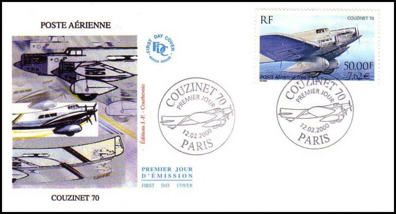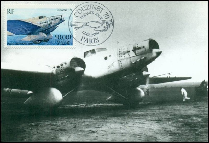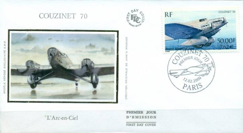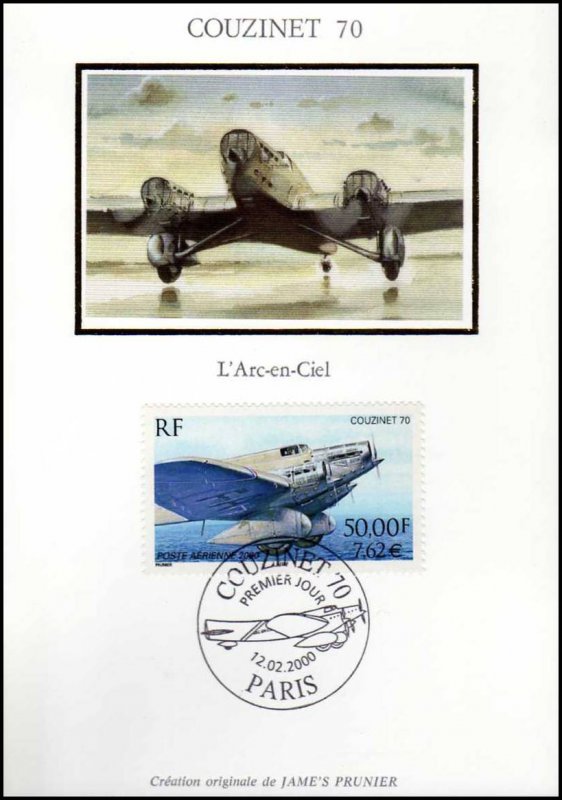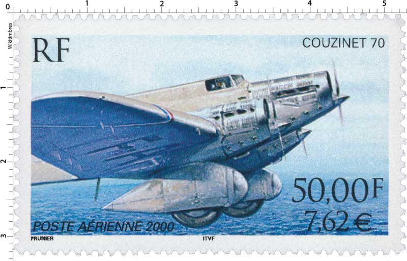 | Commentaire | Retrait le 21 juillet 2006 Description synthétique du visuel du timbre : Faisant suite au Bréguet XIV (programme 1997), au Potez 25 (programme 1998) et à l’Airbus A300-B4 (programme 1999) le Couzinet 70 symbolise à la fois l’héroïsme de Mermoz, l’ouverture de l’exploitation de la ligne France - Amérique du Sud et une belle réussite de l’industrie aéronautique. Mermoz rencontra René Couzinet et fut séduit par les performances et l’esprit novateur de l’avion. Nommé aussi Arc en ciel (ARC pour avion René Couzinet) cet avion marqua largement son époque. Des ailes basses en bois et toile, une grande finesse et une dérive se fondant dans le fuselage ont conféré à ce trimoteur son aspect caractéristique. La seconde guerre mondiale gêna l’exploitation normale de cet avion, qui fut détruit par les allemands. Il est représenté sur le visuel survolant l’atlantique entre la France et l’Amérique du Sud. Ce timbre a également été émis en feuillet de 10 TP et est alors dentelé 13 x 13demi et comporte des mentions imprimées sur les marges du feuillet. |