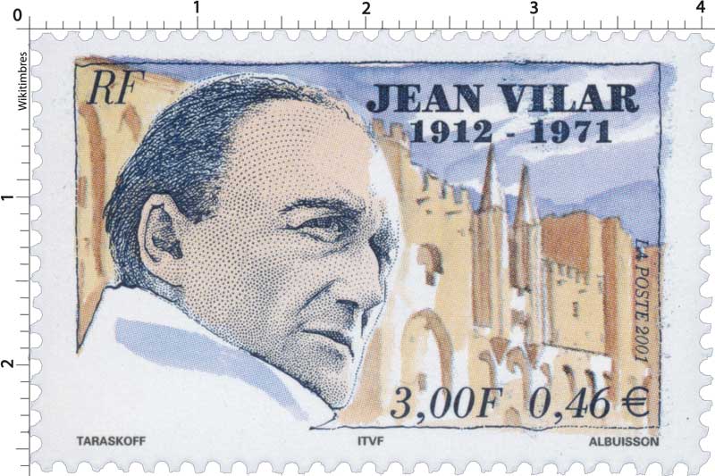 Description synthétique du visuel du timbre : Jean Vilar est né à Sète le 25 mars 1912. Il débarque à Paris en 1932, sans argent et sans travail. Intéressé d’abord par le cinéma, il rejoint néanmoins la troupe de la Roulotte en 1941 à titre de comédien et d’auteur dramatique.
