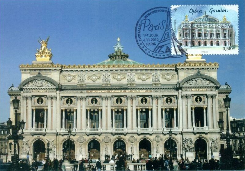 | Commentaire | PREMIER JOUR : 4 novembre 2010 Vente Anticipée : au Salon d’Automne - Paris (Porte de Champerret) et le Carré d’Encre -Paris VENTE NATIONALE à partir du 8 novembre 2010 Visuel : la façade Sud de l’Opéra Garnier dominant la Place de l'Opéra à Paris. Les quatre groupes principaux : la poésie (François Jouffroy) - la musique instrumentale (Eugène Guillaume) - la danse (Jean-Baptiste Carpeaux) et le drame lyrique (Jean-Joseph Perraud). |