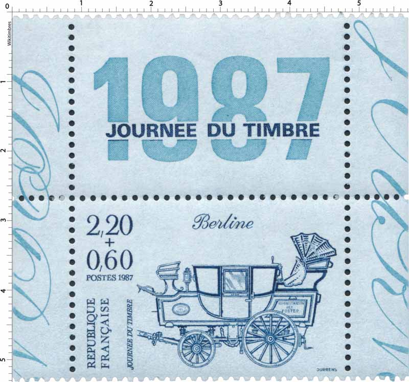 Timbre : 1987 JOURNÉE DU TIMBRE Berline Mesures Format d'imp 36 x 22 mm Dents incluses 40 x 26 mm Forme horizontal Phosphore Non Impression Taille-douce Complément sans marges blanches Couleur bleu sur bleu clair Valeur 2 F 20 c + 60 c Dentelure 13 Emis en carnet Quantité 972 323 Auteurs Dessinateur Claude Durrens Graveur Claude Durrens Mise en page xxxxx Mentions Création de Claude Durrens Numéros & Dates N° Philatelix - N° Michel 2600 C Date d'émission 16/03/1987 Date de retrait 16/10/1987 Classements Groupe Journée du Timbre 1987 Catégorie Timbres poste Familles diligences / bus transports Usage lettres simples Régions - Départements - Description Journée du timbre 1987. Berline. Carnet Commentaire - Mes timbres & notes personnelles www.wikitimbres.fr