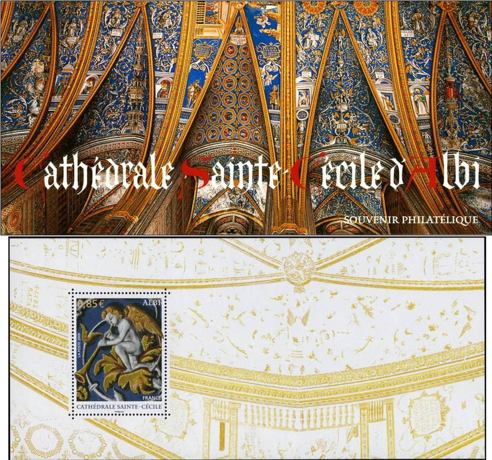 | Commentaire | La manifestation premier jour a lieu les 7 et 8 février à Albi. Un élément décoratif orne la partie supérieure du cachet spécial, créé par Sarah Lazarevic. La Basilique Sainte-Cécile qui domine la ville d'Albi est une des cathédrales les plus visitées de France. Elle a été édifiée de 1282 à 1480 et constitue un chef d'œuvre du gothique méridional. Sainte-Cécile offre un stupéfiant contraste entre la rigueur extérieure de son architecture défensive et la richesse intérieure d'une somptueuse décoration. Les fresques de la voûte dont un détail orne le timbre forment l'ensemble de peinture italienne de la Renaissance le plus vaste (97 m de long sur 28 m de large) et le plus ancien de France (1509-1513). Voulu par Louis II d'Amboise, l'ornementation du plafond a été confiée à des peintres italiens originaires de Modène et de Bologne. Les voûtes de la cathédrale sont conçues comme un ciel immense et bleu, sur lequel se développe un décor de rinceaux, d'arabesques, de candélabres, cadre de scènes au contenu pastoral. Depuis le thème d'Adam et Ève, jusqu'à l'Annonciation, sont représentés tous les personnages importants de l'Ancien et du Nouveau Testament, dans une ordonnance qui culmine avec le Christ en majesté. |