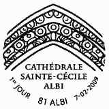 | Commentaire | La manifestation premier jour a lieu les 7 et 8 février à Albi. Un élément décoratif orne la partie supérieure du cachet spécial, créé par Sarah Lazarevic. La Basilique Sainte-Cécile qui domine la ville d'Albi est une des cathédrales les plus visitées de France. Elle a été édifiée de 1282 à 1480 et constitue un chef d'œuvre du gothique méridional. Sainte-Cécile offre un stupéfiant contraste entre la rigueur extérieure de son architecture défensive et la richesse intérieure d'une somptueuse décoration. Les fresques de la voûte dont un détail orne le timbre forment l'ensemble de peinture italienne de la Renaissance le plus vaste (97 m de long sur 28 m de large) et le plus ancien de France (1509-1513). Voulu par Louis II d'Amboise, l'ornementation du plafond a été confiée à des peintres italiens originaires de Modène et de Bologne. Les voûtes de la cathédrale sont conçues comme un ciel immense et bleu, sur lequel se développe un décor de rinceaux, d'arabesques, de candélabres, cadre de scènes au contenu pastoral. Depuis le thème d'Adam et Ève, jusqu'à l'Annonciation, sont représentés tous les personnages importants de l'Ancien et du Nouveau Testament, dans une ordonnance qui culmine avec le Christ en majesté. |