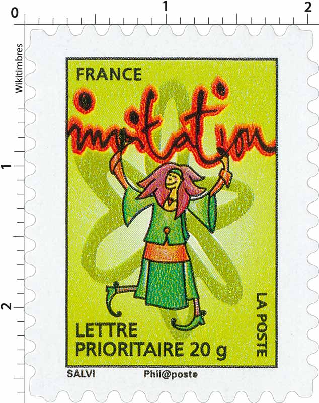 | Commentaire | La mise en vente anticipée a lieu le 5 septembre au Jardin d'acclimatation de Paris. Salvi reprend un de ses personnages en plein saut pour illustrer le cachet premier jour. « votre bonne humeur », « vos bonnes nouvelles », « votre enthousiasme », « vos envols », « vos fantaisies », « votre joie de vivre », « vos mots doux », « vos mystères », « votre patience », « vos promesses », « vos secrets », « vos surprises » ou « tous vos élans ». Timbre sans millésime |