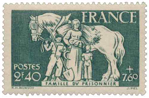 | Commentaire | Famille du prisonnier. Démonétisé le : 01/11/1944 Émis le 27 septembre 1943, le timbre « Famille du prisonnier » à 2,40 F + 7,60 F s’inscrit dans la série destinée au secours aux familles de prisonniers de guerre durant l’Occupation. L’iconographie est volontairement centrée sur la famille restée à l’arrière : le prisonnier n’apparaît pas sur le timbre. Cette absence visuelle souligne l’attente, la précarité et la dimension sociale de la captivité, dans une approche émotionnelle plutôt que militaire ou héroïque. Dessiné par R. H. Munsch et gravé par Jules Piel, le timbre adopte un format horizontal et une teinte verte sobre, renforçant le caractère grave et réaliste de la scène. La surtaxe de 7,60 F, très supérieure à la valeur faciale, est intégralement affectée au secours aux familles de prisonniers de guerre. Le timbre permet notamment l’affranchissement de la carte postale pour l’étranger, usage en lien direct avec les correspondances familiales de l’époque. Retiré de la vente le 17 février 1944, ce timbre est démonétisé le 1er novembre 1944, comme l’ensemble des émissions du régime de Vichy. |