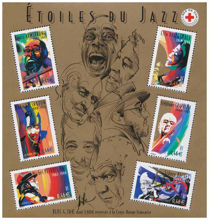 | Commentaire | ÉTOILES DU JAZZ- Description synthétique du visuel du timbre : Raymond Moretti a mis en scène ces grands artistes du jazz dans un style qui lui est propre, constitué d’un jeu d’ombres et de lumières qui met en exergue chacun des portraits sur des fonds de couleur vives et animées. L’univers qui les caractérise est évoqué souvent par le biais d’un instrument de musique ou d’un accessoire : M. Petrucciani au piano, L. Armstrong et sa trompette, E. Fitzgerald chantant, S. Grappelli et l’archet de son violon, D. Ellington directeur d’orchestre, S. Bechet et sa clarinette. Leurs portraits au trait agrémentent le fond du bloc imprimé en doré. Les mêmes timbres émis sous forme de feuilles de 50 TP sont surchargés de deux bandes phosphorescentes. |