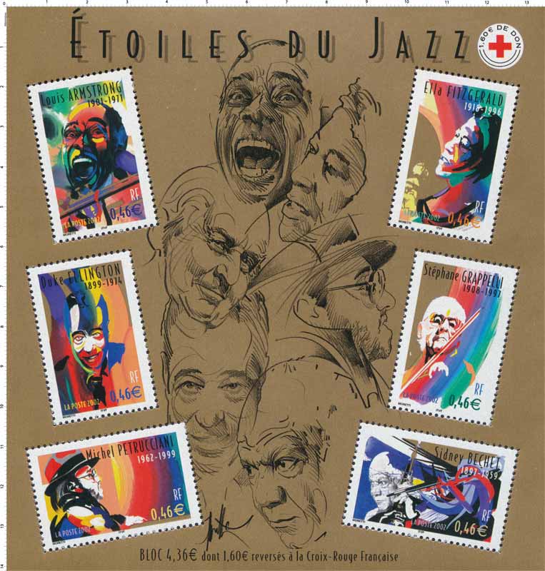 | Commentaire | ÉTOILES DU JAZZ- Description synthétique du visuel du timbre : Raymond Moretti a mis en scène ces grands artistes du jazz dans un style qui lui est propre, constitué d’un jeu d’ombres et de lumières qui met en exergue chacun des portraits sur des fonds de couleur vives et animées. L’univers qui les caractérise est évoqué souvent par le biais d’un instrument de musique ou d’un accessoire : M. Petrucciani au piano, L. Armstrong et sa trompette, E. Fitzgerald chantant, S. Grappelli et l’archet de son violon, D. Ellington directeur d’orchestre, S. Bechet et sa clarinette. Leurs portraits au trait agrémentent le fond du bloc imprimé en doré. Les mêmes timbres émis sous forme de feuilles de 50 TP sont surchargés de deux bandes phosphorescentes. |