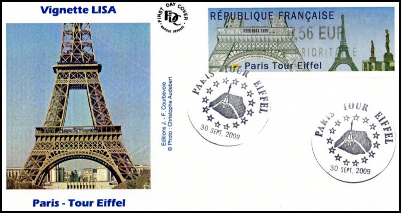| Commentaire | En rouleaux. À l’occasion de l’ouverture du futur bureau de poste de Paris Tour Eiffel (sous le pied sud de la Tour Eiffel), La Poste a décidé d’émettre une vignette LISA illustrée pour commémorer cet événement. L’ouverture de ce nouveau bureau de poste, à fréquentation très touristique, est prévue pour la première quinzaine de juin 2009. Ce bureau, d’une surface de 9 m⊃2;, devrait être ouvert 7 jours sur 7, de 9 H 30 à 23 H. |