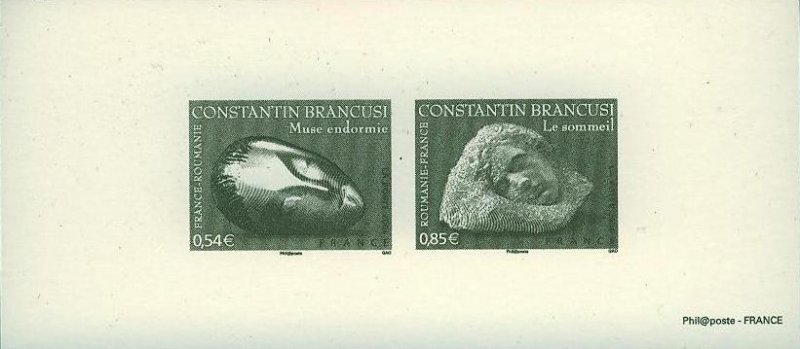 | Commentaire | Constantin Brancusi est né en 1876 à Pestisani, dans le sud de la Roumanie. Après des années d’apprentissage à Bucarest et le refus d’une bourse pour entrer dans une école italienne des beaux-arts, il rejoint la France en 1904. Il obtiendra la nationalité française en 1952 et lèguera à l’État français le contenu de ses ateliers de l’impasse Ronsin à Paris « à charge pour l’état de reconstituer l’atelier au Musée National d’Art Moderne ». Unissant nos deux pays, il est légitime que deux de ses œuvres – Muse endormie, conservée en France au Musée National d’Art Moderne à Paris et Le sommeil conservé au Musée national d’Art de Bucarest - illustrent les timbres célébrant l’émission commune France Roumanie. Le sommeil, en marbre, taillée en 1908 préfigure l'apparition du thème de la Muse endormie. La Muse endormie, tête inclinée, a été réalisée en bronze en 1910 et témoigne de la réflexion de Brancusi sur la simplification des formes et sa volonté d’épurer la matière. Avec lui, la sculpture moderne est née. |