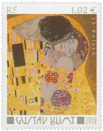 | Commentaire | Description synthétique du visuel du timbre : Né à Vienne le 14 juillet 1862, fils de graveur, élève à l’académie des Beaux-arts, Gustav Klimt ouvre en 1883 un atelier de décors de théâtre et de décorations murales. Il est l’initiateur de la fondation du groupe de la « sécession » de Vienne en 1897. Pour Klimt, la peinture semble avoir pour but de trouver son intégration dans un environnement architectural et ses compositions qui occupent harmonieusement l’espace montrent arabesques, volutes, motifs décoratifs, mosaïques abstraites et feuilles d’or contribuant à une grande somptuosité. Un détail de l’œuvre la plus célèbre de Klimt, Le baiser, illustre le timbre. Réalisée entre 1907 et 1908, elle appartient à une phase de création appelée la phase dorée. La beauté de cette peinture s’appuie autant sur la valeur précieuse (et équivoque) que lui confère l’usage du doré que sur la représentation d’un couple d’amoureux, global, cosmique, à la fois lié à la nature et isolé du monde. |