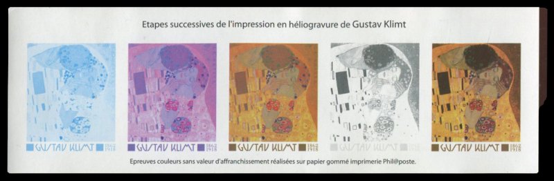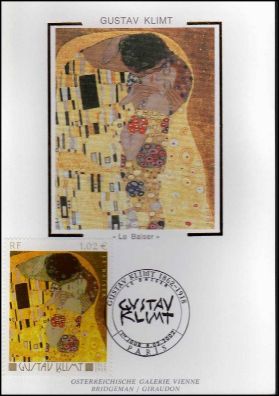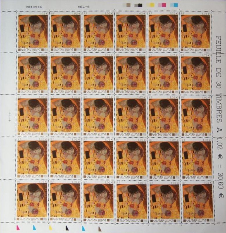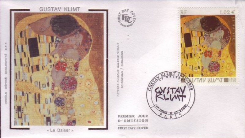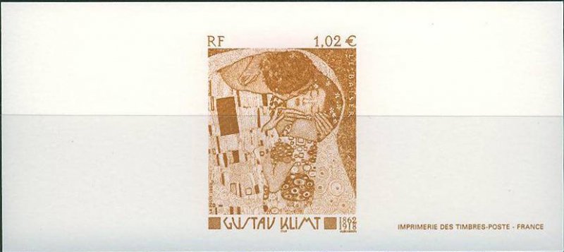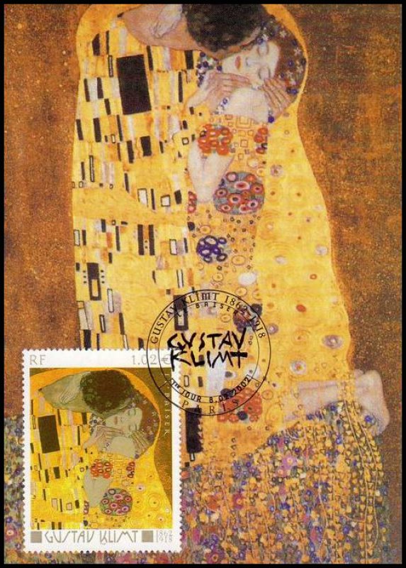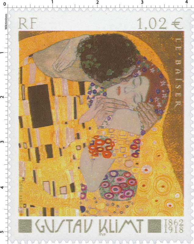 | Commentaire | Description synthétique du visuel du timbre : Né à Vienne le 14 juillet 1862, fils de graveur, élève à l’académie des Beaux-arts, Gustav Klimt ouvre en 1883 un atelier de décors de théâtre et de décorations murales. Il est l’initiateur de la fondation du groupe de la « sécession » de Vienne en 1897. Pour Klimt, la peinture semble avoir pour but de trouver son intégration dans un environnement architectural et ses compositions qui occupent harmonieusement l’espace montrent arabesques, volutes, motifs décoratifs, mosaïques abstraites et feuilles d’or contribuant à une grande somptuosité. Un détail de l’œuvre la plus célèbre de Klimt, Le baiser, illustre le timbre. Réalisée entre 1907 et 1908, elle appartient à une phase de création appelée la phase dorée. La beauté de cette peinture s’appuie autant sur la valeur précieuse (et équivoque) que lui confère l’usage du doré que sur la représentation d’un couple d’amoureux, global, cosmique, à la fois lié à la nature et isolé du monde. |