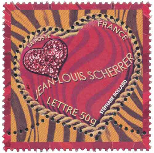 | Commentaire | Cette année 2006, Jean-Louis Scherrer rejoint le cercle des couturiers « timbrifiés » après Yves Saint-Laurent, Christian Lacroix, Torrente, Chanel et Cacharel. Dessinés par Stéphane Rolland, à qui la maison Jean-Louis Scherrer a confié la création de ses lignes haute-couture depuis 1997, les 2 timbres - un timbre à prisme et un timbre zébré - complètent la collection des « cœurs griffés ». Timbre sans millésime |