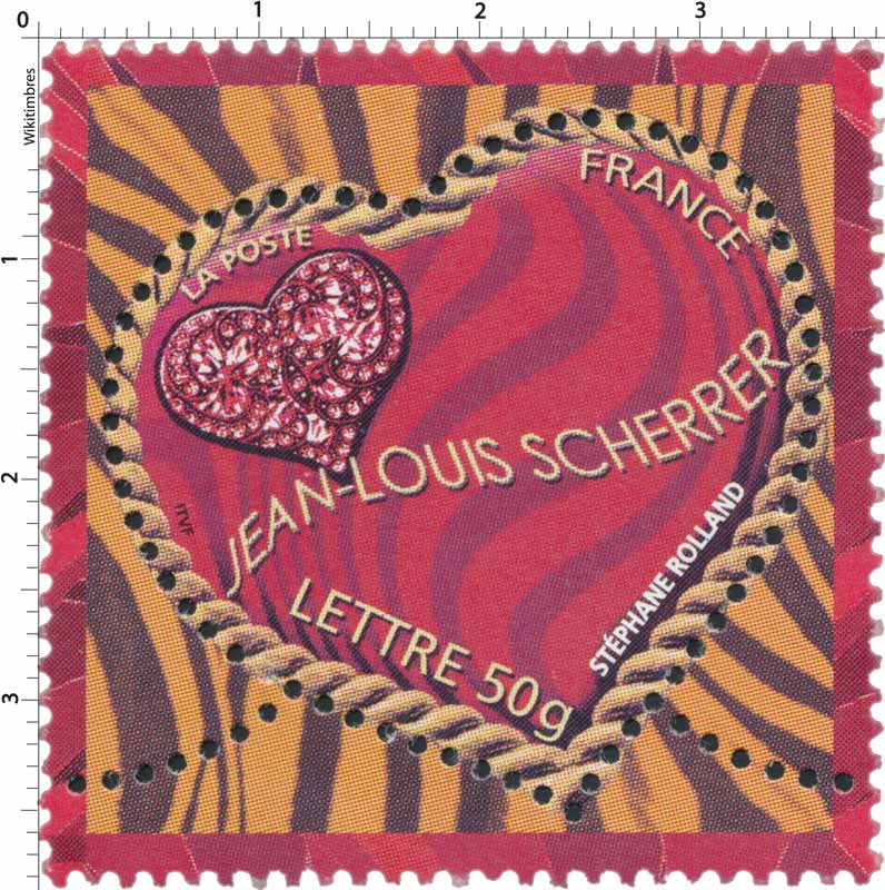 | Commentaire | Cette année 2006, Jean-Louis Scherrer rejoint le cercle des couturiers « timbrifiés » après Yves Saint-Laurent, Christian Lacroix, Torrente, Chanel et Cacharel. Dessinés par Stéphane Rolland, à qui la maison Jean-Louis Scherrer a confié la création de ses lignes haute-couture depuis 1997, les 2 timbres - un timbre à prisme et un timbre zébré - complètent la collection des « cœurs griffés ». Timbre sans millésime |