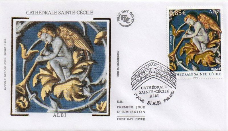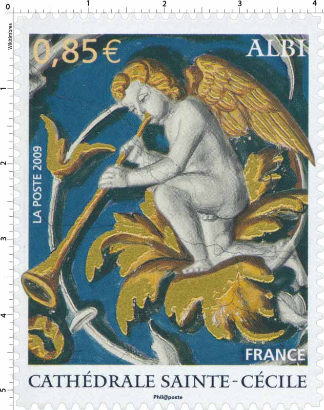 | Commentaire | Existe également sur papier gommé. La manifestation premier jour a lieu les 7 et 8 février à Albi. Un élément décoratif orne la partie supérieure du cachet spécial, créé par Sarah Lazarevic. La Basilique Sainte-Cécile qui domine la ville d'Albi est une des cathédrales les plus visitées de France. |