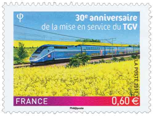 | Commentaire | Existe également en autoadhésif. Le 27 septembre 1981 furent mis en service simultanément le premier train à grande vitesse (TGV) et la première ligne à grande vitesse (LGV) sur le territoire français. Le 27 septembre 2011, 30 années exactement se sont écoulées depuis cette mise en service. À cette même date la nouvelle ligne ferroviaire à grande vitesse LGV Rhin-Rhône est achevée et en cours de recette par Réseau Ferré de France, avec l’aide de la SNCF, avant la mise en service officielle des TGV sur cette ligne prévue en décembre 2011.
