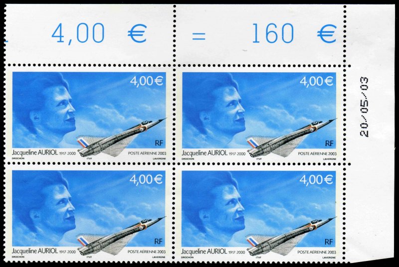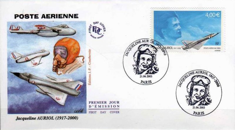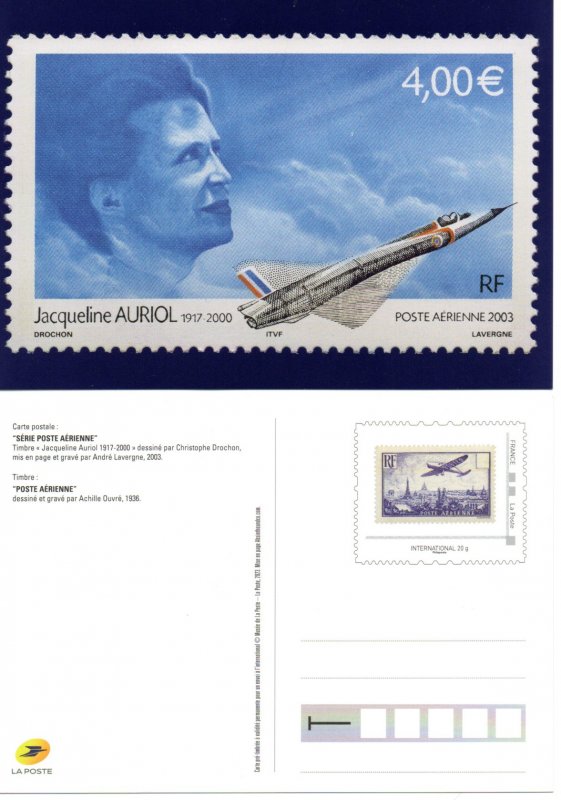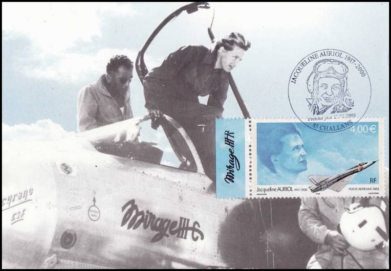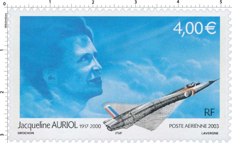 | Commentaire | JACQUELINE AURIOL 1917 - 2000 Description synthétique du visuel du timbre : Sur le contour de la mini feuille figurent des plans coupes de certains des avions qu’a piloté Jacqueline Auriol et sur lesquels elle a établi différents records du monde de vitesse : le Mystère IV N (record en 1955), le Mirage III R (record en 1963) et le Mystère 20 (record en 1965). Ce timbre a également été émis en feuillet de 10 TP et est alors dentelé 13 x 13demi et comporte des impressions sur les marges du feuillet. Le timbre de feuille comme le timbre du feuillet de 10 TP sont imprimés sur papier neutre sous UV. |