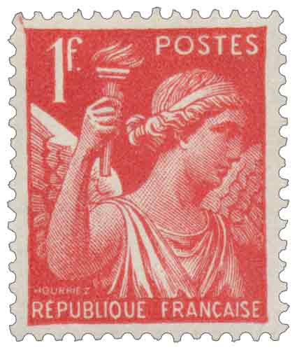 | Commentaire | 2e tarif Le timbre à 1 franc rouge de la série Iris, dessiné et gravé par Georges Hourriez, représente la déesse messagère de la mythologie grecque, symbole de communication adapté au contexte postal de la fin de la Troisième République. Imprimé en typographie rotative par feuilles de 100, il est dentelé 14 × 13½ et sert principalement à l'affranchissement de la lettre simple intérieure au tarif de juin 1940. Mis en service progressivement en zone occupée durant l'été 1940, avec des usages attestés dès juillet, il répond aux besoins nés de la division du territoire après l'armistice. Des tirages destinés à des carnets inaboutis ont été écoulés en feuilles de 80 à partir de mars 1941. |