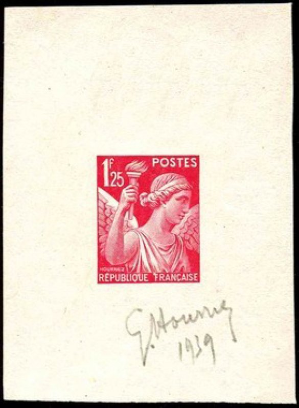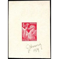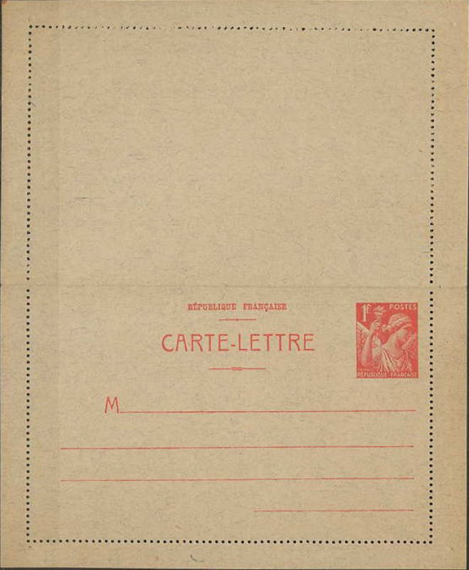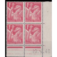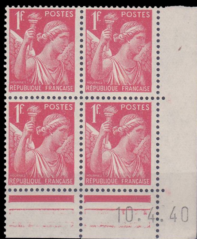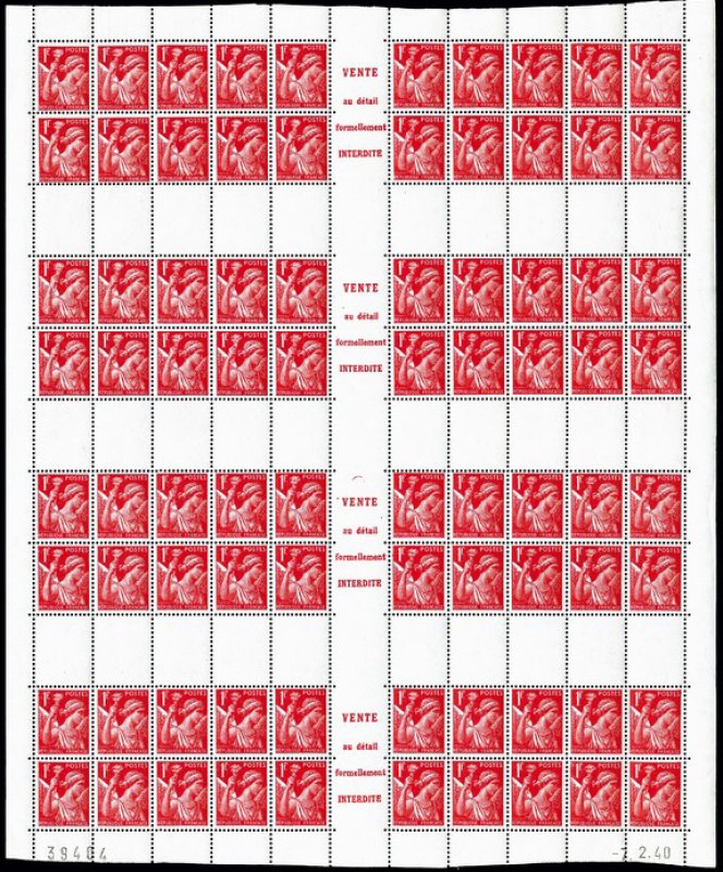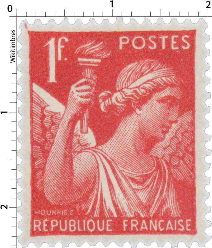 | Commentaire | 2e tarif Le timbre à 1 franc rouge de la série Iris, dessiné et gravé par Georges Hourriez, représente la déesse messagère de la mythologie grecque, symbole de communication adapté au contexte postal de la fin de la Troisième République. Imprimé en typographie rotative par feuilles de 100, il est dentelé 14 × 13½ et sert principalement à l'affranchissement de la lettre simple intérieure au tarif de juin 1940. Mis en service progressivement en zone occupée durant l'été 1940, avec des usages attestés dès juillet, il répond aux besoins nés de la division du territoire après l'armistice. Des tirages destinés à des carnets inaboutis ont été écoulés en feuilles de 80 à partir de mars 1941. |