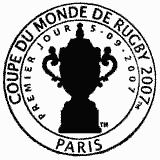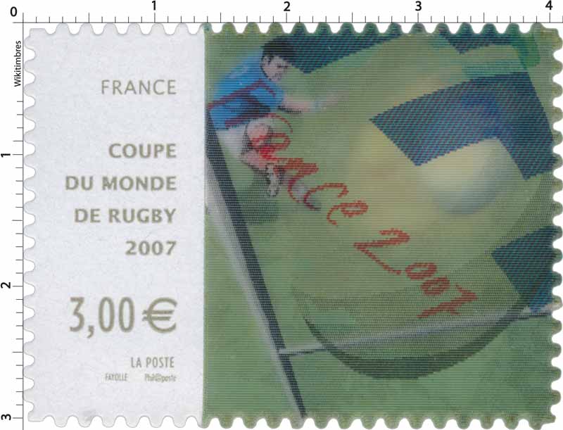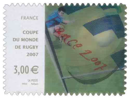 | Description | Coupe du monde de Rugby 2007. Timbre autocollant, utilisant l'imagerie lenticulaire pour reproduire le parcours d'un ballon de rugby lors de la transformation d'un essai |