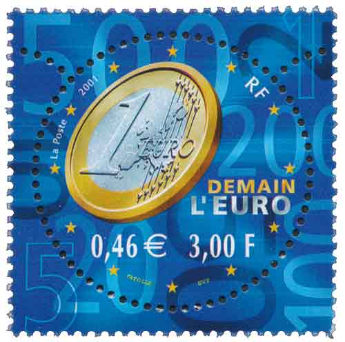 | Commentaire | Description synthétique du visuel du timbre : L’euro est la monnaie que la France et ses partenaires de l’Union européenne ont décidé d’avoir en commun. Le 1er janvier 1999, l’euro est devenu la monnaie unique européenne. Le 1er janvier 2002, les pièces et les billets en euros seront mis en circulation et remplaceront les monnaies nationales dans les pays de la Communauté européenne qui font partie de la zone euro, contribuant ainsi à créer une union économique et monétaire à part entière. Pour célébrer son arrivée et familiariser les français à l’euro , le timbre met en scène la pièce de un euro, côté face commune à tous les pays, sur un fond évoquant les prochains billets en euro. |