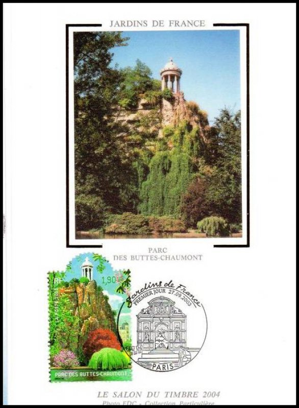 | Commentaire | LE SALON DU TIMBRE 2004 Rocher du Parc des Buttes Chaumont. Description synthétique du visuel du timbre : Le salon philatélique 2004 se déroulera au parc floral. Deux blocs évoquant les parcs et jardins de France seront émis à cette occasion. Le 1er bloc à paraître en 2003 met à l’honneur le parc des Buttes-Chaumont, jardin paysager donnant l’illusion de paysages naturels et variés, inspiré des parcs anglais, et le jardin du Luxembourg, de style français, offrant une grandiose ordonnance et de larges perspectives classiques. Ce bloc intègre 2 timbres de format original, jamais réalisé. Le bloc présente également une découpe originale et est conçu pour être plié de façon à évoquer l’ouverture d’un portail sur un jardin. |