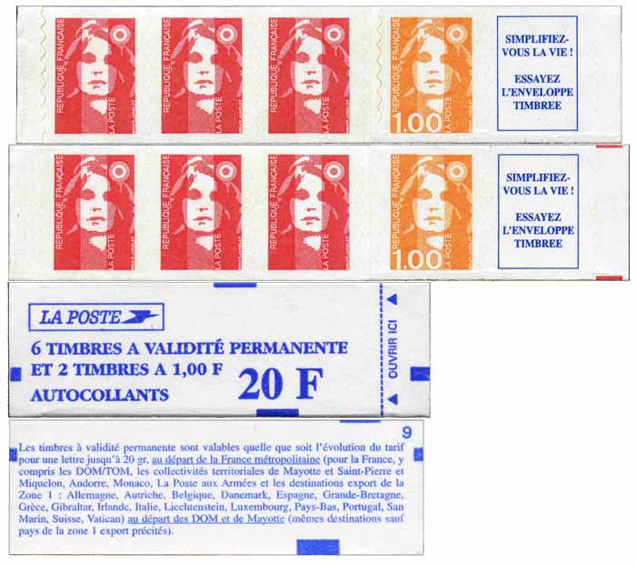 | Commentaire | Composé de deux bandes comprenant chacune 3TVP, 1 timbre à 1.00f et une vignette Simplifiez-vous la vie Essayez l'enveloppe timbrée. Carnet pour distributeur En savoir plus sur Wikipédia : Marianne du Bicentenaire |