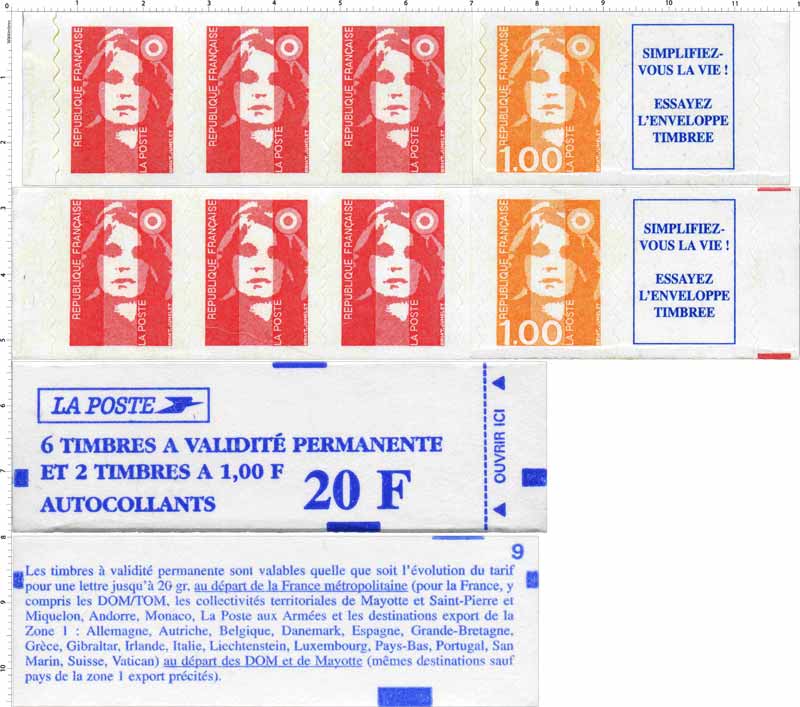 | Commentaire | Composé de deux bandes comprenant chacune 3TVP, 1 timbre à 1.00f et une vignette Simplifiez-vous la vie Essayez l'enveloppe timbrée. Carnet pour distributeur En savoir plus sur Wikipédia : Marianne du Bicentenaire |