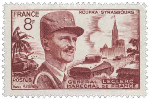 | Commentaire | Voir la vidéo "Histoires de timbres" Émis en France en 1953, le timbre-poste gommé « Général Leclerc, Maréchal de France » constitue une réédition, dans une nouvelle couleur et avec une titulature actualisée, du timbre de 1948 consacré à Philippe Leclerc de Hauteclocque, figure majeure de la France libre, et s’inscrit dans la continuité des émissions commémoratives dédiées à la Libération ; mis en vente à Paris le 13 juin 1953 puis dans les autres bureaux à compter du 15 juin, ce timbre horizontal de 8 francs répond à l’affranchissement de la carte postale, usage courant qui assure une large diffusion mémorielle, tandis que son iconographie associe le serment de Koufra à la libération de Strasbourg, symbolisée par la flèche de la cathédrale figurant à droite du motif, résumant ainsi l’épopée militaire de la 2e division blindée ; dessiné et gravé en taille-douce par Raoul Serres, il témoigne de la maîtrise française de cette technique d’impression, offrant un rendu précis et solennel adapté au sujet, et trouve sa place parmi les timbres de 1953 évoquant la Seconde Guerre mondiale et ses chefs militaires ; l’émission intervient peu après l’élévation à titre posthume de Leclerc à la dignité de maréchal de France, conférant à ce timbre une portée à la fois historique et symbolique, une anecdote iconographique souvent relevée étant le pli particulier du képi représenté, rappelant celui bricolé à Koufra à partir d’une chéchia, détail discret mais historiquement attesté et consensuel.