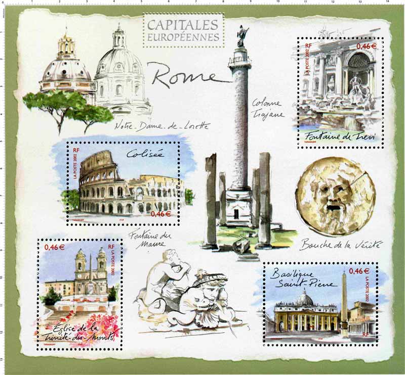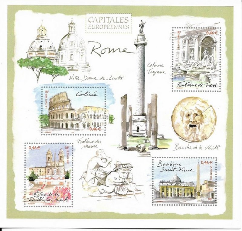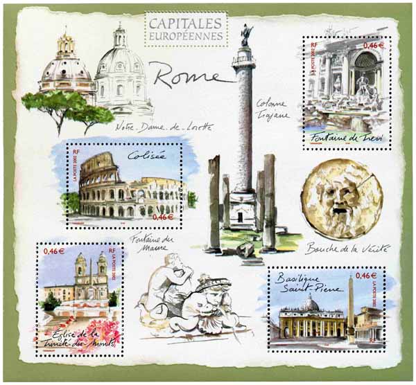 | Commentaire | Description synthétique du visuel du timbre : En 2002 débute une nouvelle série de timbres dédiée aux capitales européennes. A plus d’un titre, Rome mérite d’inaugurer cette série. Elle est notamment la ville dans laquelle ont été signés, le 25 mars 1957, les traités de Rome qui ont donné naissance à la Communauté Économique Européenne (CEE) et à la Communauté Européenne de l’Énergie Atomique (EURATOM). Réalisé en aquarelle, ce premier bloc présente des monuments de Rome dans un style évoquant les carnets de voyage. Le Colisée, la basilique Saint-Pierre, la fontaine de Trevi et l’église de la Trinité-des-Monts illustrent les timbres. L’église Notre-Dame-de-Lorette, la colonne Trajane, la bouche de la vérité et un détail de la fontaine du Maure sur la place Navone agrémentent le fond du bloc. |