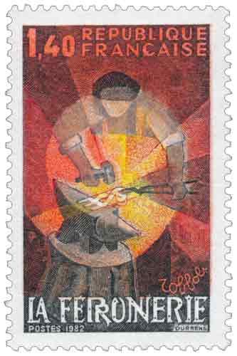 | Commentaire | Ce timbre appartient à la série des Métiers d’art, par laquelle l’administration postale française met en valeur des savoir-faire artisanaux constitutifs du patrimoine culturel et technique du pays, après avoir déjà consacré des émissions à la lutherie, à la broderie ou à la reliure. Le sujet renvoie à la ferronnerie d’art, discipline issue d’une longue histoire du travail du fer, dont les origines remontent à l’âge du Fer et aux premières maîtrises métallurgiques développées par les sociétés antiques et médiévales. Dès le Moyen Âge, la ferronnerie occupe une place essentielle dans l’architecture et l’ornementation, depuis les grilles, pentures et serrureries jusqu’aux ensembles monumentaux qui accompagnent l’essor des styles roman et gothique. L’évolution des techniques, passant de l’artisanat ambulant aux ateliers équipés de martinets hydrauliques, permet l’élaboration d’ouvrages complexes associant forge, assemblage et décor en tôle battue, témoignant d’un haut niveau de maîtrise technique et esthétique. Ce timbre évoque également la reconnaissance progressive du ferronnier comme artisan et artiste, capable de concevoir des œuvres uniques destinées aussi bien à l’espace public qu’à l’architecture religieuse ou civile, à l’image des grandes grilles monumentales réalisées à l’époque classique. L’émission s’inscrit dans un contexte de redécouverte et de valorisation des métiers manuels au tournant des années 1980, période marquée par une attention renouvelée portée au patrimoine, à la restauration des édifices anciens et à la transmission des gestes traditionnels. À travers ce timbre, la philatélie française souligne la permanence d’un art du métal fondé sur la créativité, la précision du geste et le dialogue entre tradition et modernité, affirmant le rôle du timbre comme vecteur de mémoire des savoir-faire et des métiers d’excellence. Article rédigé pour WikiTimbres |