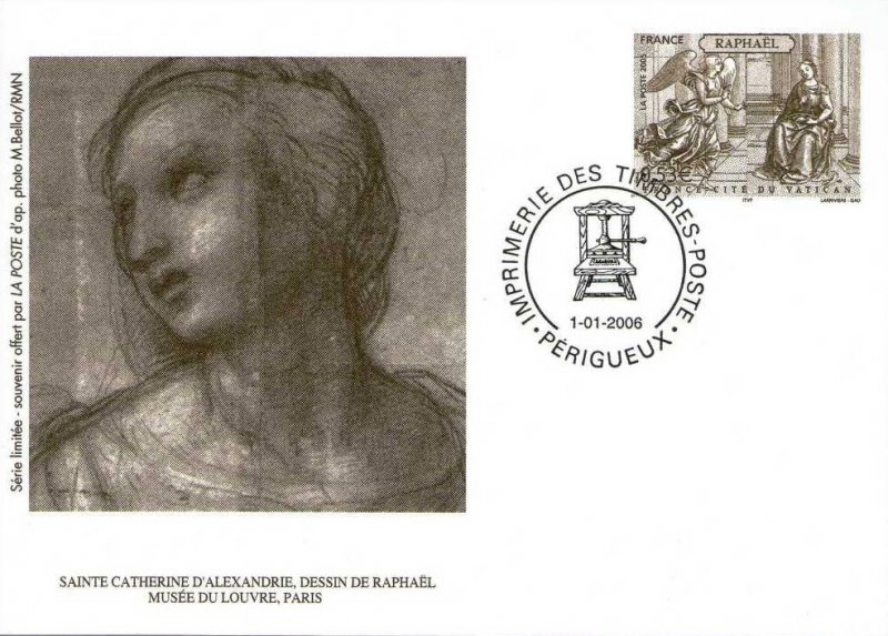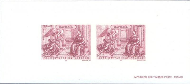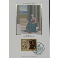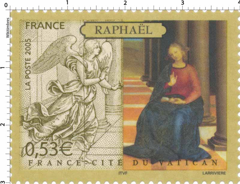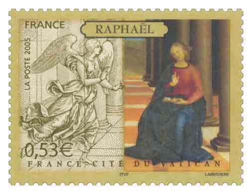 | Commentaire | En 2005 a été inscrite une émission commune avec la Cité du Vatican, sur le thème d’un grand artiste commun au musée du Vatican et au musée du Louvre. Cette émission se présente sous la forme d’un bloc incluant 2 timbres. En fond de bloc : l’œuvre peinte « l’Annonciation » de Raphaël, conservée au musée du Vatican et le dessin préparatoire conservé au musée du Louvre. Les 2 timbres différents reproduisent des détails de l’œuvre, sous ses 2 formes. « L’Annonciation » est un des épisodes du « Couronnement de la Vierge » peinte pour la prédelle du retable Oddi vers 1502-1504.Émission commune France-Vatican. |