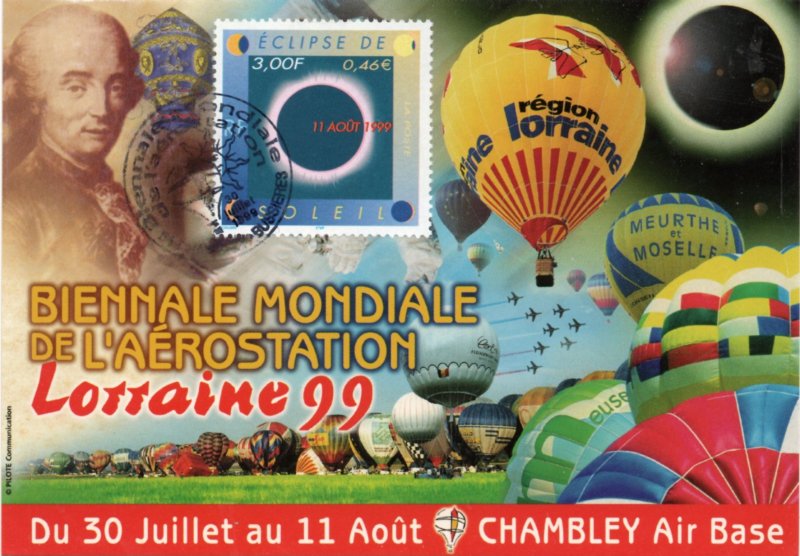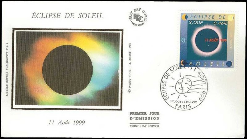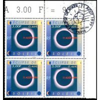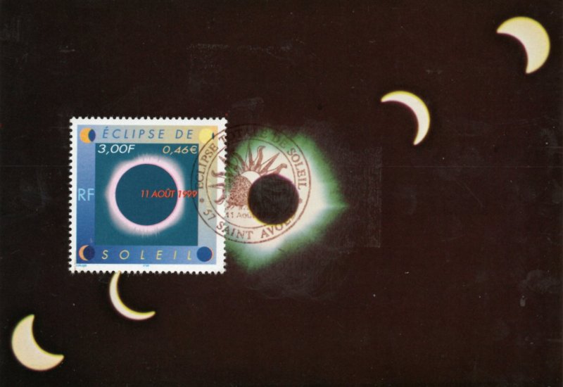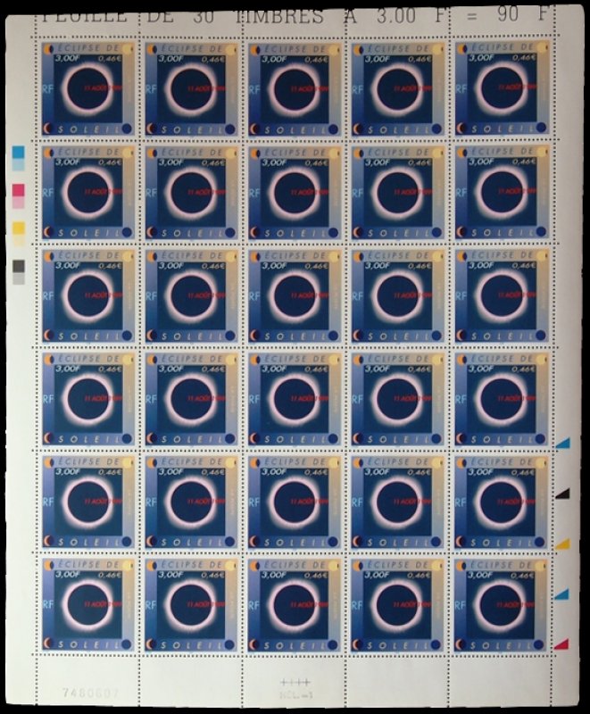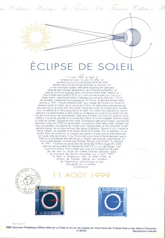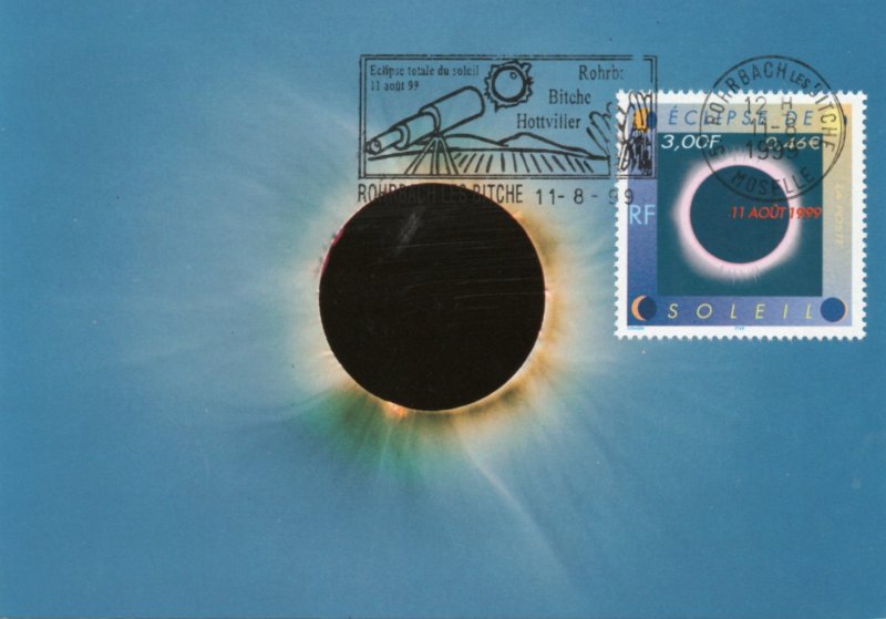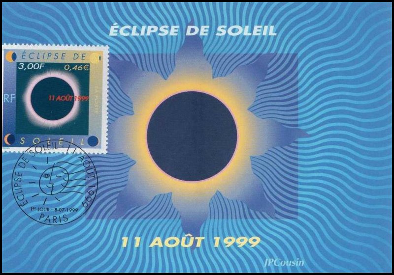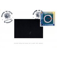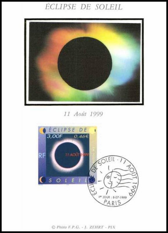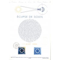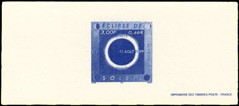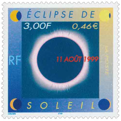 | Commentaire | Description synthétique du visuel du timbre : Le 11 août 1999, la France sera touchée par un événement astronomique majeur : une éclipse totale de soleil. Elle se traduira au sol par le déplacement d’une zone elliptique de nuit quasi-totale qui touchera Cherbourg à 12 h 16 et Strasbourg à 12 h 32 avant de s’éloigner en direction de l’Europe centrale puis de l’Asie. Le recouvrement progressif du cercle solaire par la lune est exprimé aux quatre coins du timbre. Durant les quelques minutes que dure l’obscurité, le disque noir de la lune est perlé de rose et une large auréole l’entoure : c’est la couronne. |