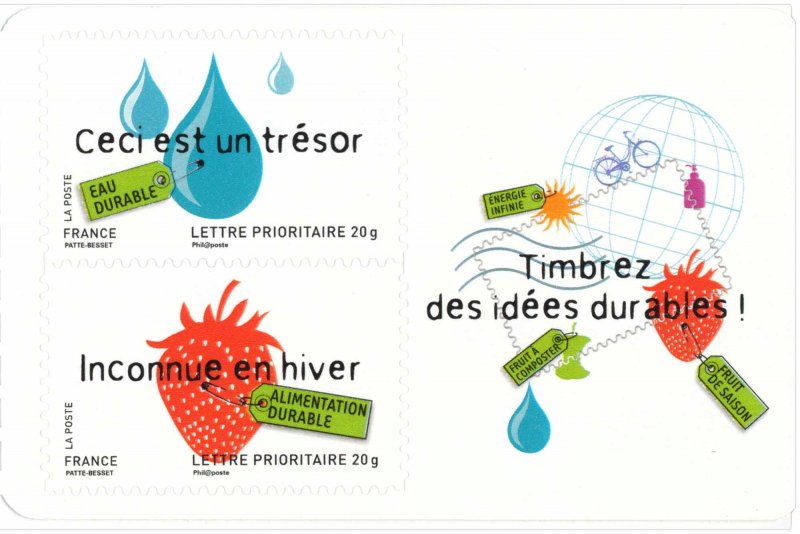 | Commentaire | La mise en vente anticipée a lieu du 14 au 22 juin au Salon du timbre, à Paris. Le cachet d'oblitération premier jour reprenant les éléments de trois des timbres : l'arbre, les gouttes d'eau et le soleil. Timbre sans millésime |
