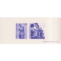 | Commentaire | Description synthétique du visuel du timbre : A l’occasion de l’exposition internationale Philexfrance 99, hommage est rendu à trois chefs d’œuvre du Musée du Louvre sous forme de timbres : « La Liberté guidant le peuple », d’Eugène Delacroix, « La Joconde » de Léonard de Vinci et « La Vénus de Milo ». Ces trois timbres sont disposés sur un fond marbré dans lequel s’intègre une quatrième œuvre, la Chatte Bastet |