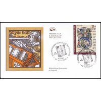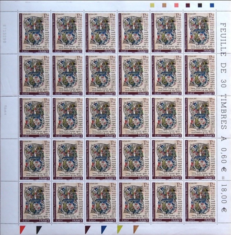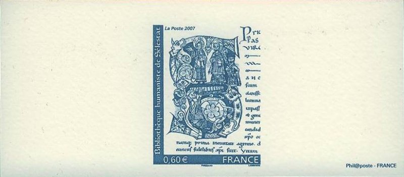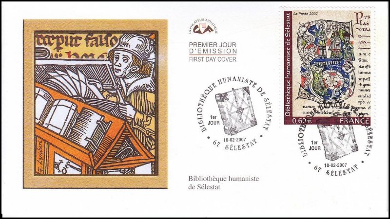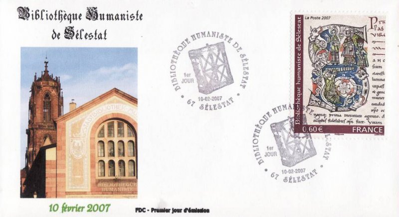| Commentaire | La bibliothèque humaniste de Sélestat figure parmi les 32 bibliothèques les plus célèbres du monde occidentale. Fondée en 1452, par un legs de livres par Jean de Westhuss, recteur de l’église paroissiale, la bibliothèque s’enrichit par la suite du fonds que l’humaniste Beatus Rhenanus légua à sa ville natale en 1547. La bibliothèque, installée depuis 1889 dans l’ancienne halle aux blés, rappelle l’école humaniste de Sélestat et la place que tint cette ville impériale dans l’histoire de l’humanisme rhénan de 1441 à 1525. Une lettrine extraite du Livre des miracles de Ste Foy, un manuscrit daté du XIe siècle, illustre le timbre. |