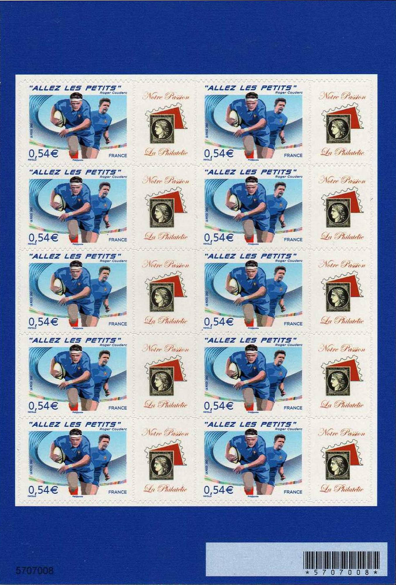 | Commentaire | En vue de la prochaine coupe du monde de Rugby qui se déroulera en France en septembre 2007, La Poste émet un premier timbre « annonce » en avril 2007. Pour soutenir et encourager les « Bleus » tous reprennent le légendaire « Allez les petits » que clamait le célèbre commentateur Roger Couderc. |