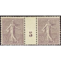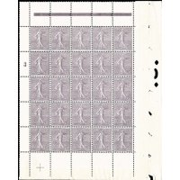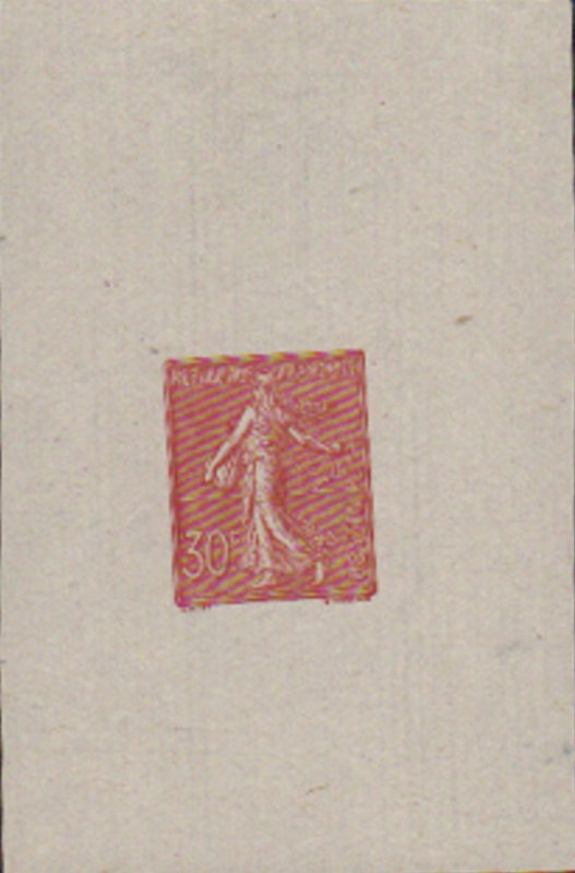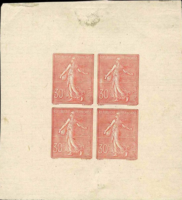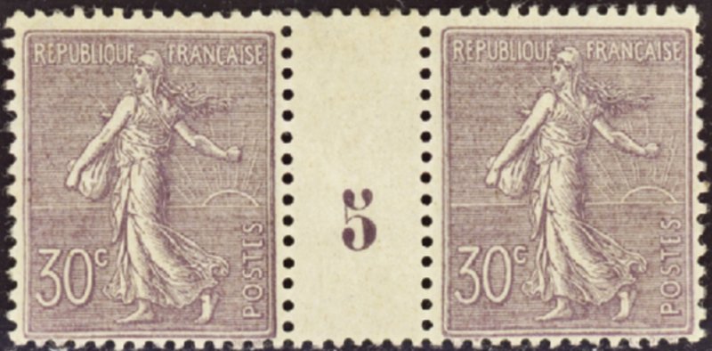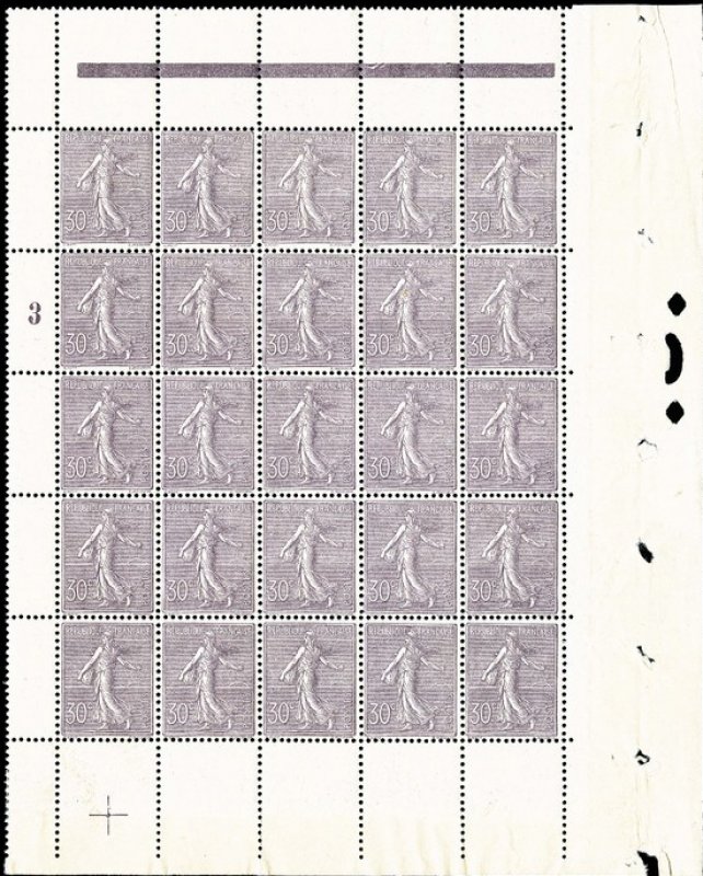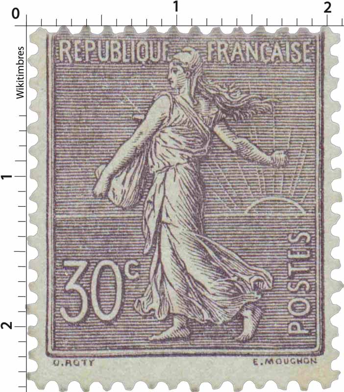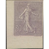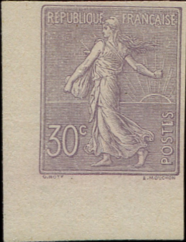 | Commentaire | Semeuse lignée. Nota Les ombres portées sur la Semeuse sont mal positionnées par rapport au soleil, de plus elle sème contre le vent Le 30 centimes lilas – Semeuse lignée (Yvert & Tellier n°133), mis en vente en juin 1903 et retiré en mai 1907, appartient à la première grande série des Semeuses lignée, ces timbres emblématiques du début du XXᵉ siècle qui marquent l’entrée de la France dans une iconographie résolument moderne. Dessinée par Oscar Roty et gravée par Louis-Eugène Mouchon, la Semeuse lignée représente une figure allégorique semant à contre-vent, avançant avec détermination sous un fond constitué de lignes horizontales. Ce décor, associé à la présence du soleil levant sur les premières émissions, confère au timbre une dimension symbolique forte : diffusion de la lumière, espoir, régénération du pays après la fin du XIXᵉ siècle. La valeur 30 centimes joue un rôle tarifaire essentiel dans la période 1903-1907, notamment pour l’affranchissement de certaines lettres à destination de l’étranger ou d’imprimés lourds, ce qui explique la présence d’un large éventail d’oblitérations sur les exemplaires circulés. Le tirage réel n’est pas connu avec précision, mais la valeur reste nettement moins commune que les 10 c ou 15 c de la même série. Imprimé en typographie, dentelé 14 × 13½, au format 20 × 24 mm, ce 30 c lilas est produit en feuilles de 150 timbres. La nuance lilas présente quelques variations subtiles selon les tirages, un point d’attention fréquent chez les collectionneurs spécialisés des Semeuses. Le YT 133 constitue aujourd’hui une pièce recherchée dans les collections avancées de Semeuses lignée, particulièrement en neuf avec gomme intacte, où sa cote élevée reflète la rareté relative des exemplaires bien conservés. C’est un classique incontournable des émissions de la Belle Époque.