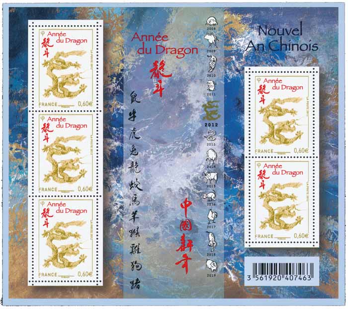 | Commentaire | Le premier calendrier astrologique est apparu sous le règne de l'empereur Huang au 3e millénaire avant Jésus-Christ. Inscrite dans un cycle de 12 ans, chaque année du calendrier chinois est placée sous le signe d’un animal. Le 23 janvier 2012, nous entrerons dans l'année du Dragon, symbole de l’empereur de Chine. Alors qu’en Occident les dragons sont considérés comme malfaisants, les anciens chinois les considéraient comme des bons génies et les représentaient à la fois comme redoutables et protecteurs. Les premiers motifs en forme de dragon sont apparus à l’époque néolithique et c’est à l’époque Han (entre 200 avant J.-C. et 220 après. J.-C. environ) que la physionomie du dragon est fixée. Appelé lóng en chinois, il est associé au serpent mais aussi au nuage et à l’eau, et vit au fond des océans ou au coeur des gros nuages.