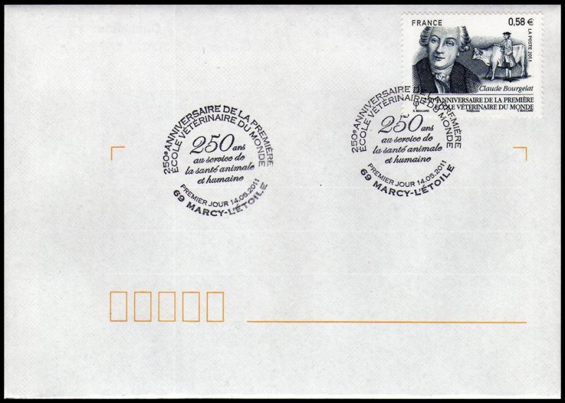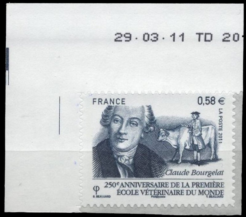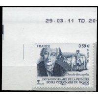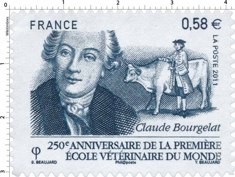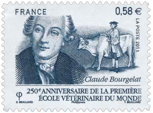 | Commentaire | Existe également sur papier gommé. C'est à Claude Bourgelat que L'on doit La création, il y a 250 ans à Lyon, de La première école vétérinaire du monde. Pour célébrer cet évènement, 2011 a été déclarée Année Mondiale Vétérinaire