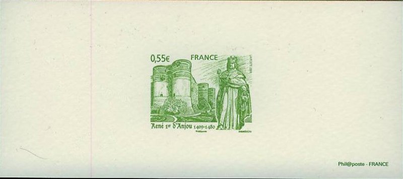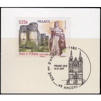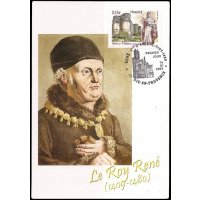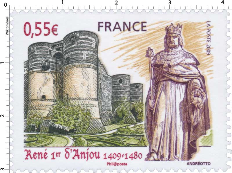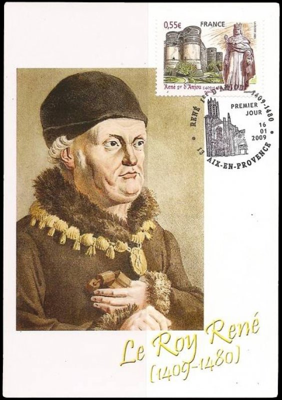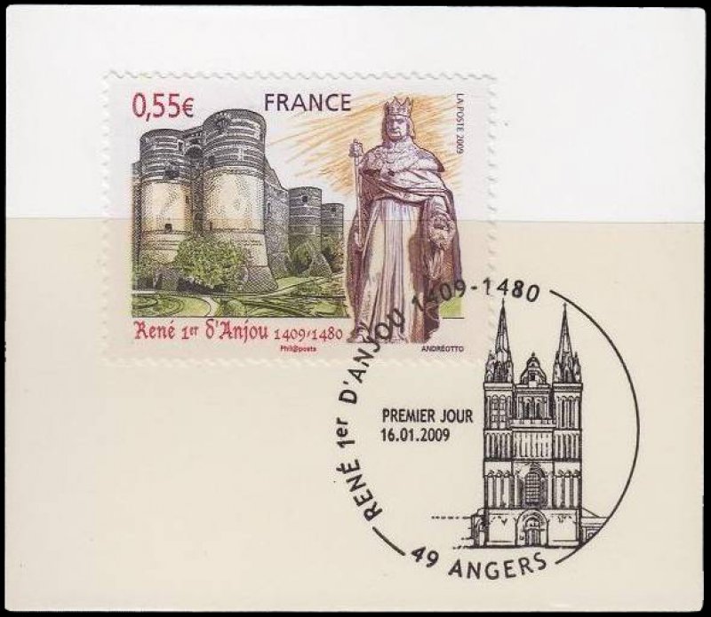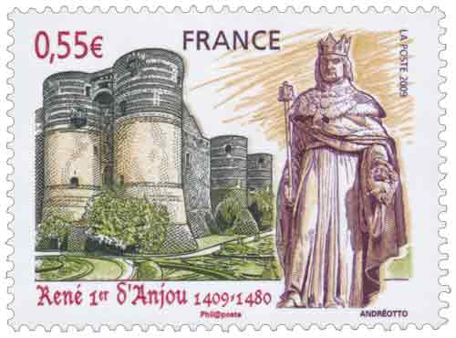 | Commentaire | La mise en vente anticipée a lieu du 16 au 18 janvier à Aix-en-Provence et les 16 et 17 janvier à Angers. Chaque ville dispose d'un cachet premier jour par Andréotto et Odette Baillais : la façade de la cathédrale Saint-Maurice pour celui disponible à Angers et la cathédrale Saint-Sauveur pour celui d'Aix-en-Provence. René Ier d’Anjou est né en 1409 à Angers. L’année 2009 verra donc la commémoration du 6e centenaire de sa naissance. Duc d’Anjou et Comte de Provence, il fût également Duc de Lorraine, Roi de Naples et de Sicile. Beau-frère du roi Charles VII, il soutint celui-ci contre les anglais et contribua à l’arrêt des luttes franco-anglaises. Il consacra son temps à l’administration et au développement économique de l’Anjou, de la Lorraine et de la Provence. Ami des lettres et des arts, il fût un mécène généreux pour les artistes, architectes et poètes. Esprit des plus complets de son époque, généreux, le Roi René était proche du peuple ce qui lui valut le nom du « Bon Roi René ». Il mourut à Aix-en-Provence en 1480 mais fût enterré dans la cathédrale d’Angers. |