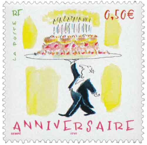 | Description | Timbre pour anniversaire. Représentation d'un majordome portant à bout de bras un gigantesque gâteau d'anniversaire. Dessin de Sempé, illustrateur, né en 1932 à Bordeaux |