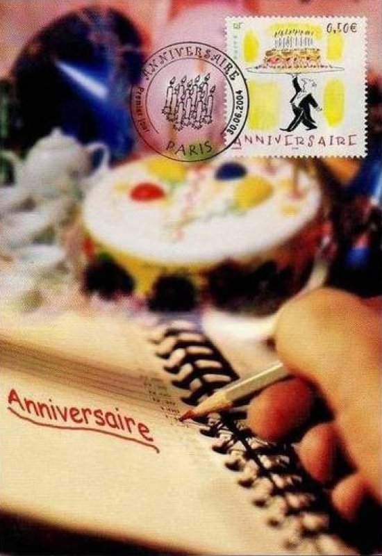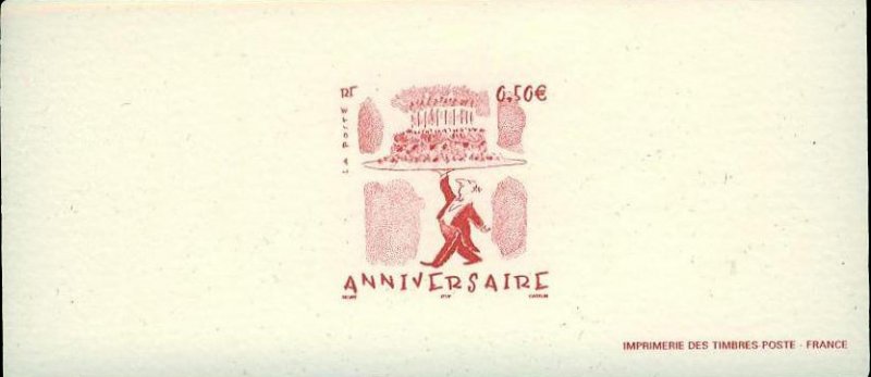| Commentaire | Les anniversaires seront souhaités en 2004 par une création de Jean-Jacques Sempé. Le garçon de café au gigantesque gâteau d’anniversaire illustrera le timbre. Jean-Jacques Sempé rencontre René Goscinny et en 1959, il publie en collaboration la série du petit Nicolas. En 1962, les Éditions Denoël (envers qui il vouera une reconnaissance éternelle) publie son premier album de dessins humoristiques. Depuis il travaille pour des journaux et réalise depuis 1979 régulièrement des couvertures pour The New Yorker. Il a publié aux Éditions Denoël 26 albums de dessins humoristiques. Le petit Nicolas ainsi que ses albums sont traduits dans le monde entier. Il vit à Paris où il expose régulièrement. Timbre sans millésime |